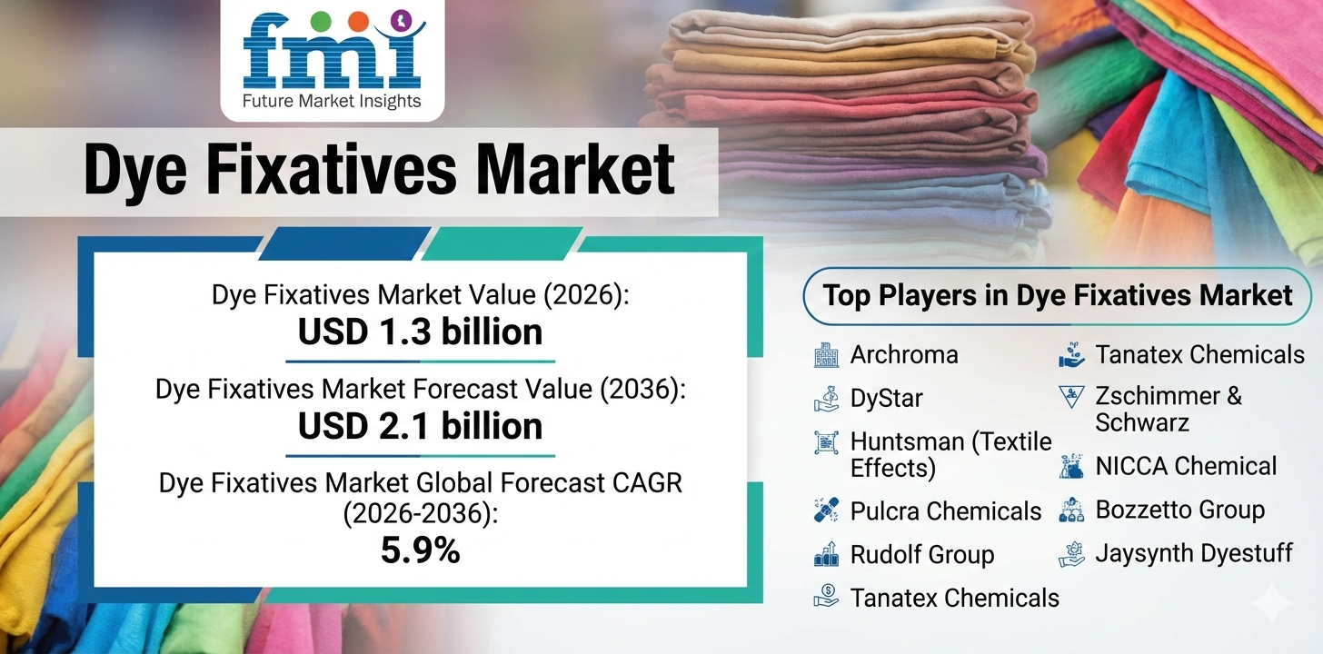 NEWARK, DE, UNITED STATES, February 25, 2026 /EINPresswire.com/ -- The global Dye Fixatives Market is projected to grow steadily over the next decade, expanding from USD 1.3 billion in 2026 to USD 2.1 billion by 2036, registering a CAGR of 5.9%. Demand is fueled by rising consumption in textile wet processing, garment washing units, home textiles, and specialty fabric applications. As textile manufacturers prioritize color durability, regulatory compliance, and sustainable production processes, dye fixatives are becoming essential performance enhancers across global textile value chains.