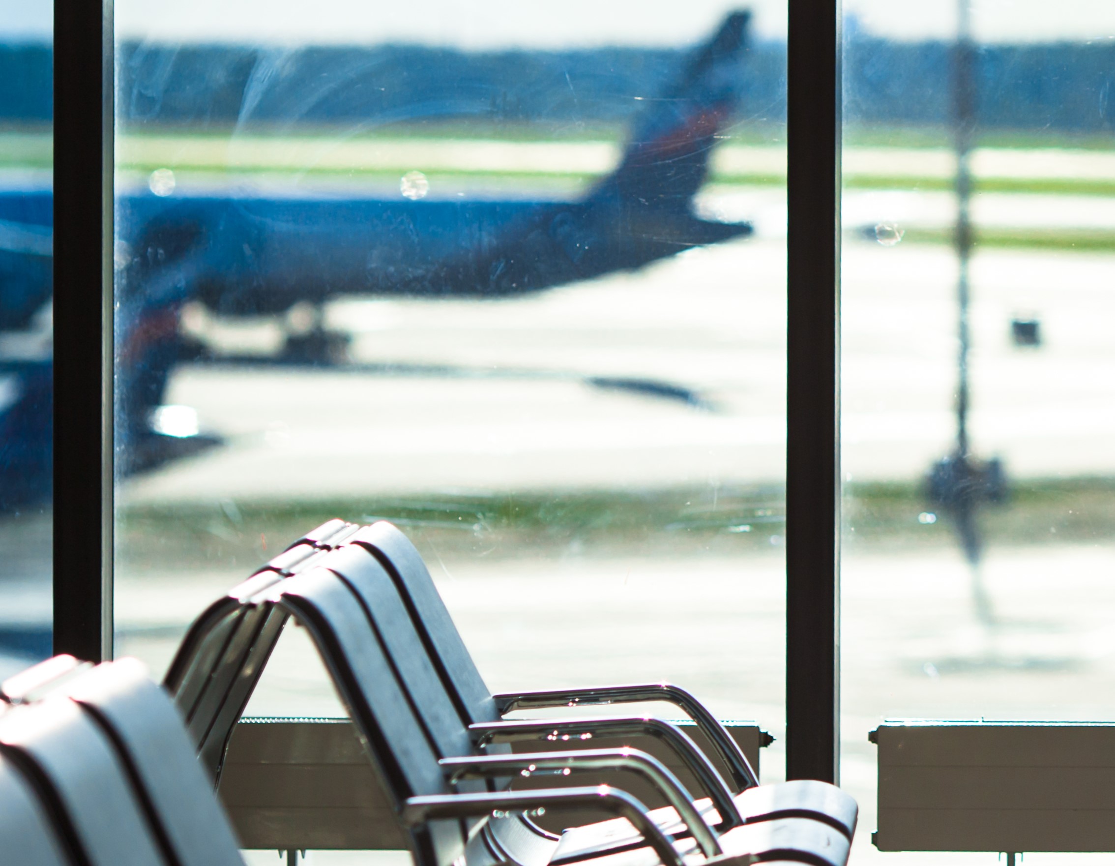 Chair in an airport next to a window with an airplane.